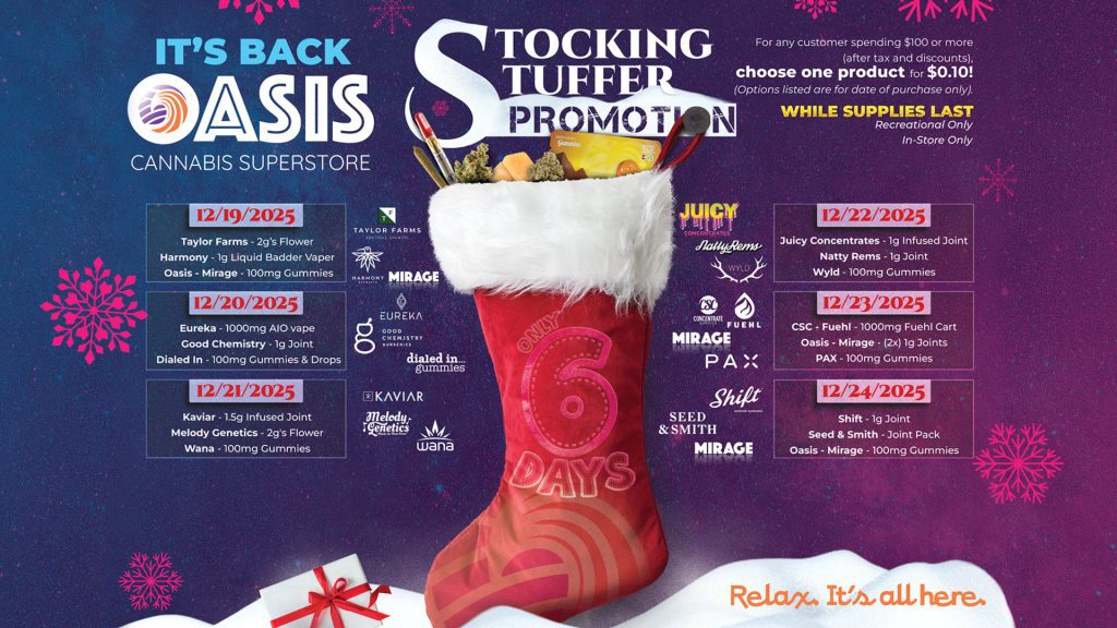 STOCKING STUFFER PROMOTION! 12/19/2025 – 12/24/2025 In-Store Only | Don’t Miss Out For any customer spending $100 Or more (after tax and discounts), CHOOSE ONE PRODUCT for $0.10! (options listed are for date of purchase only) ONLY 6 DAYS! Recreational Only | Whiles Supplies Last ONE PROMO ITEM PER DAY 12/19/2025 Harmony – […]