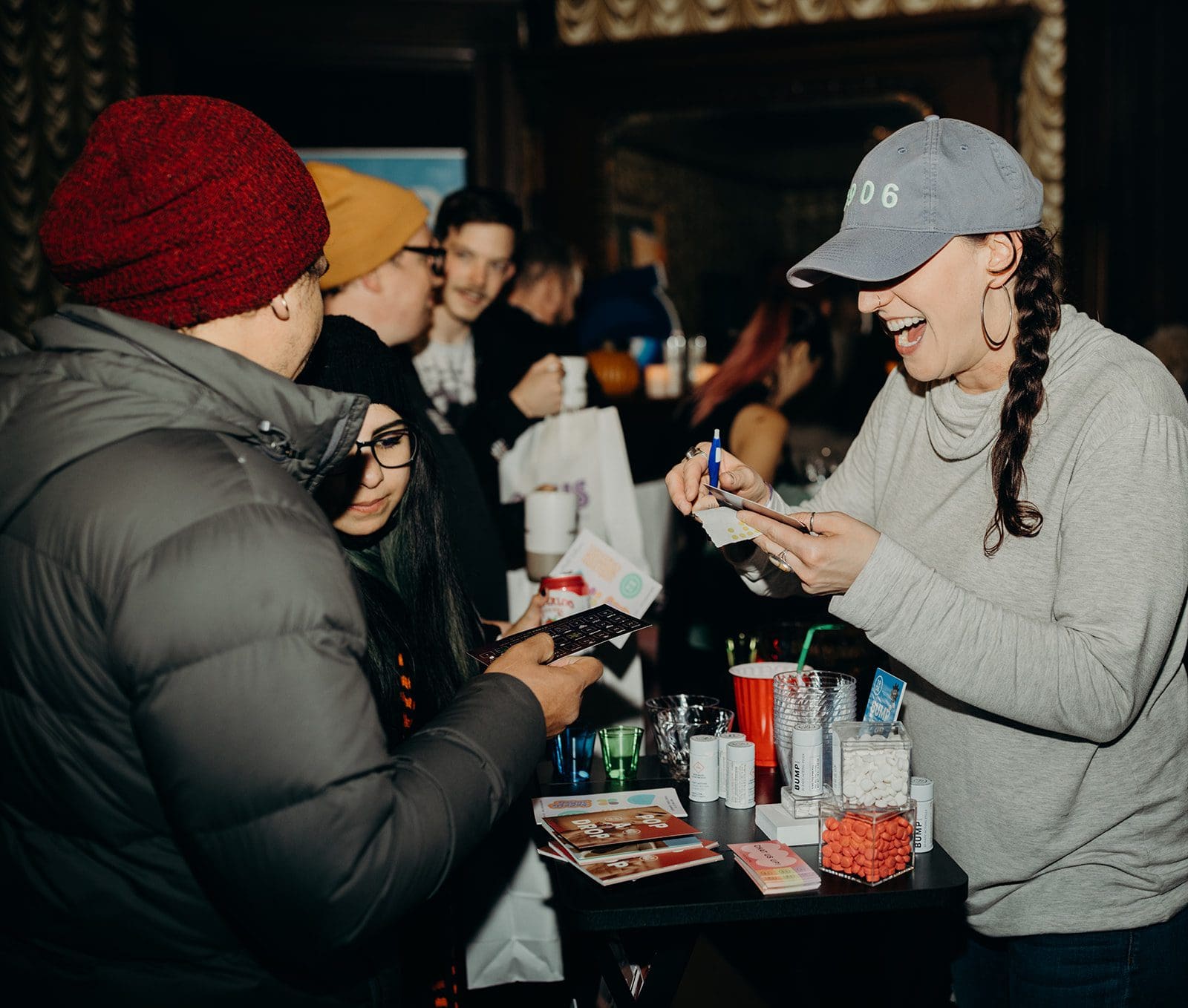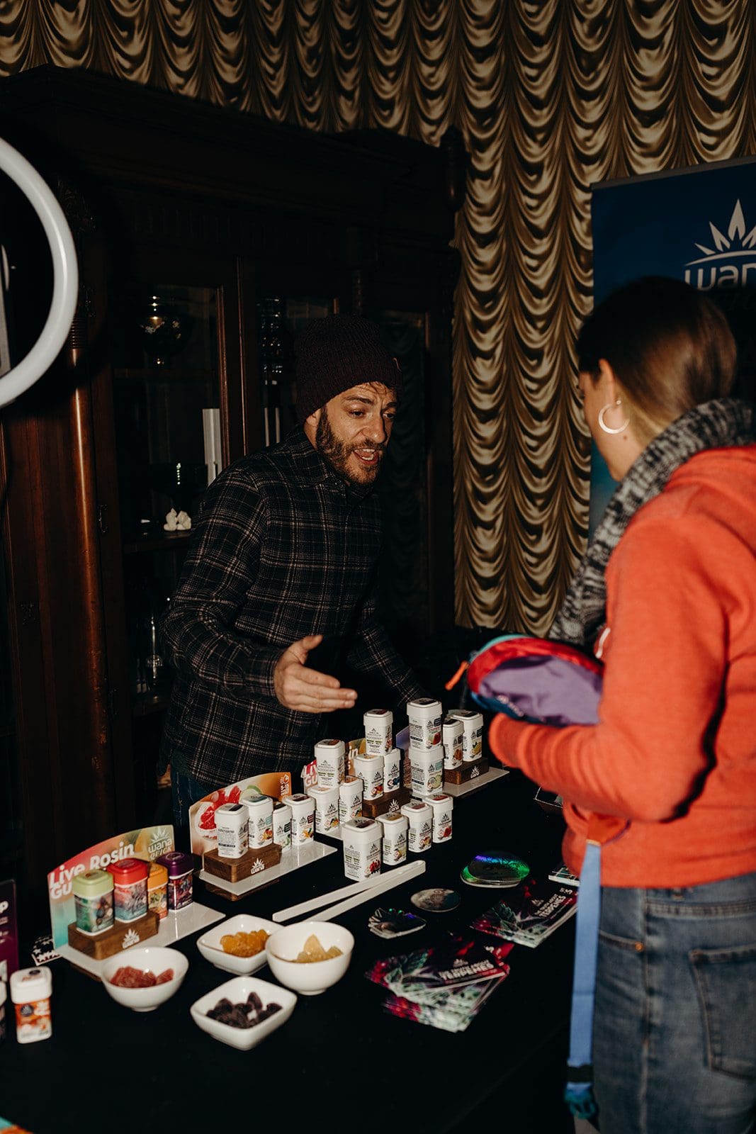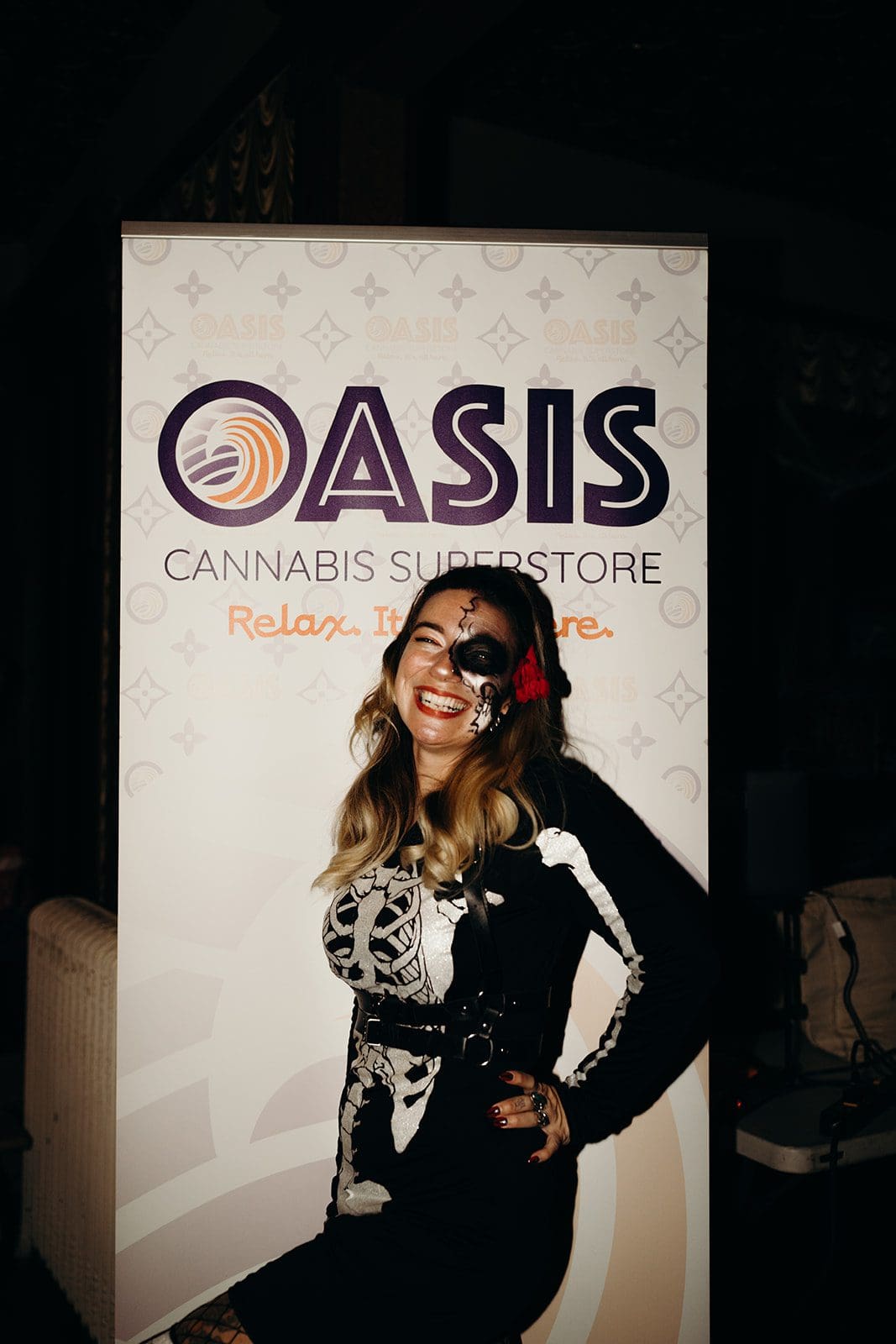 Each attendee was given a card and tasked with visiting vendor partner booths stationed on each floor of the mansion. The first floor was edibles (along with the Oasis booth, DJ, bar, and food. The second-floor featured flower vendors, and the third floor, concentrate vendors. When attendees tried products and “activated” with a vendor, they received a sticker on their card and a raffle number. Once attendees completed all stations, they brought their cards to the Oasis booth, where they received a raffle ticket for a final drawing at the end of the night. Prizes could then be redeemed at either Oasis Cannabis Superstore location for $.10. All participants who completed the event received 20% off a purchase up to $100 at either Oasis location.